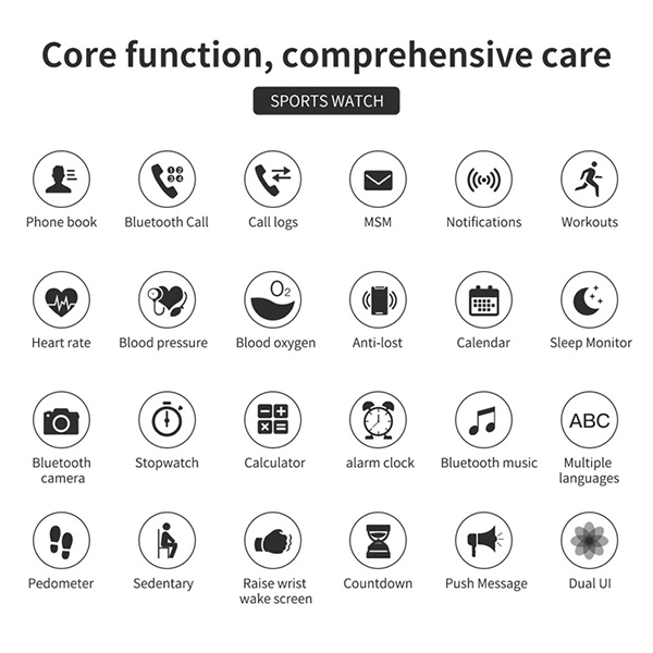 - قابلیت های ویژهسنجش فشارخون،ضربان قلب،اکسیژن خون بررسی تنفس کرونومتر آب و هوا برآورد میزان خواب قابلیت نمایش اعلانات پیامک و شبکه های اجتماعی تنظیم نور صفحه نمایش قابلیت رمزگذاری بررسی میزان کالری و... در فعالیتهای فضای باز(دوچرخه سواری و ....) بررسی میزان کالری و... در فعالیتهای داخلی ( دویدن داخل سالن و...)